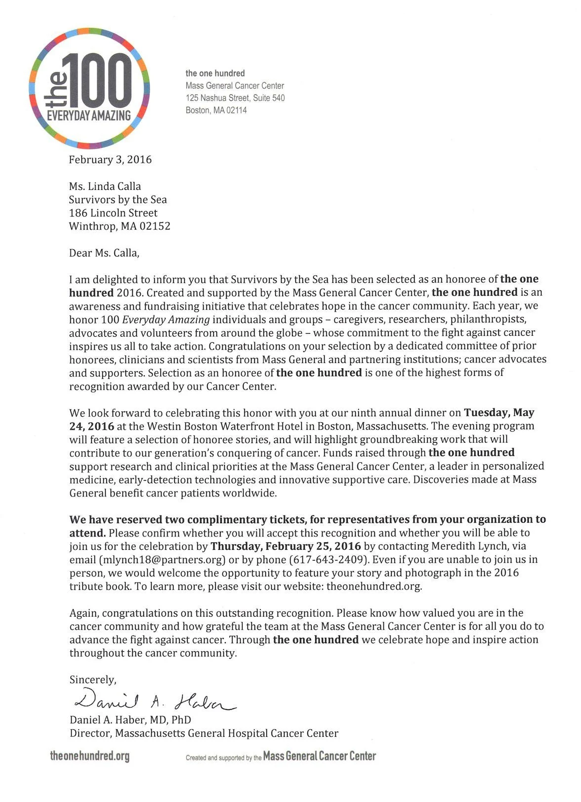 Survivors by the Sea was selected as an honoree of the one hundred 2016! Below is a copy of the official letter we received from Mass General Cancer Center so you can read it and believe it with your own eyes! Honorees are selected through a public nomination process and celebrated at a spring gala in Boston.